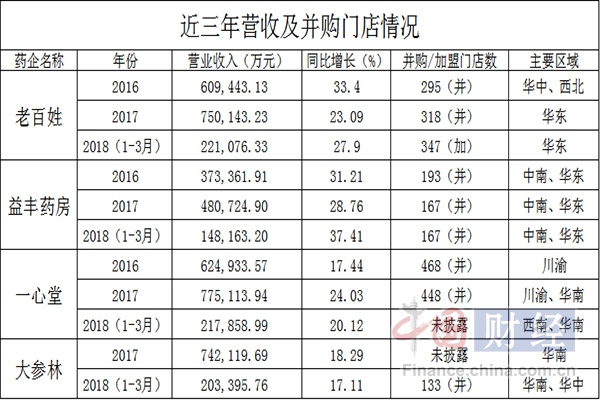 中國(guó)網(wǎng)財(cái)經(jīng)記者梳理發(fā)現(xiàn),老百姓大藥房2016年至2018年一季度財(cái)報(bào)顯示,其并購(gòu)門店數(shù)目呈逐年增加態(tài)勢(shì),期間累計(jì)并購(gòu)或加盟數(shù)量達(dá)到960家。其中,僅2018年一季度就加盟了347家。益豐藥房2018年一季度并購(gòu)門店數(shù)目則已經(jīng)趕上了2017年全年的并購(gòu)門店數(shù)目。一心堂2018年一季度報(bào)告中并未披露并購(gòu)門店數(shù)目,但據(jù)媒體報(bào)道,其2018年半年來累計(jì)新增門店數(shù)為338家。據(jù)大參林一季度財(cái)報(bào)顯示,1-3月新增門店263家,其中自建130家,收購(gòu)門店133家,閉店14家。