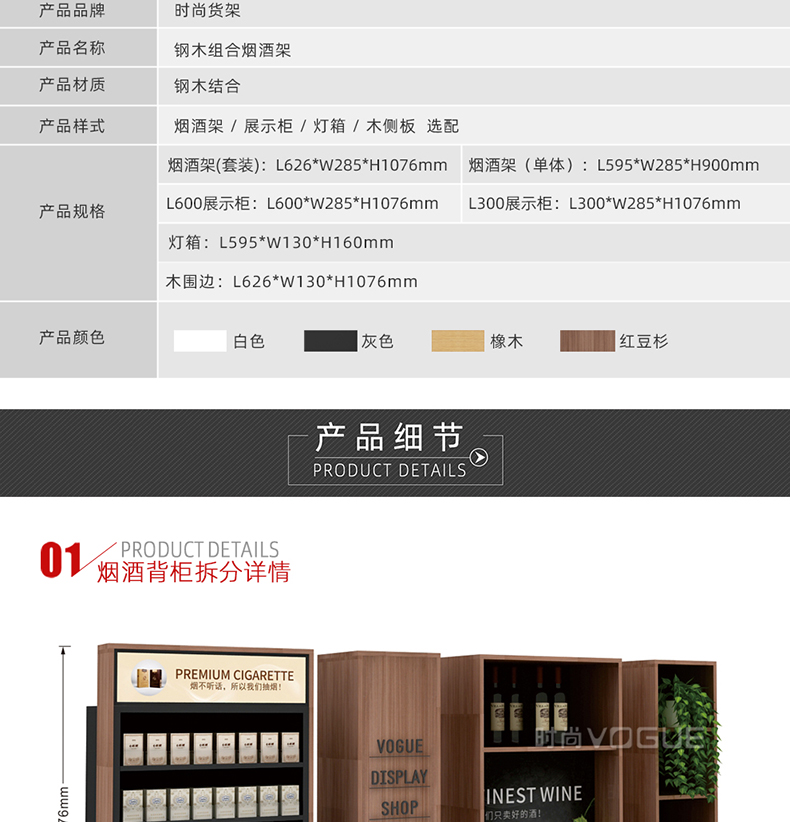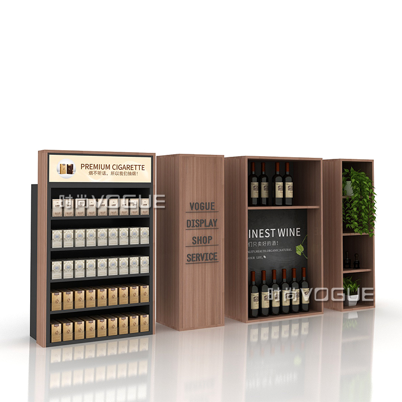 收銀臺紅酒架組合而成。便利店煙酒架立柱采用優質鋼材,具有很好的承重能力。頂部配有磁吸燈箱廣告牌,即可宣傳品牌,又可以指引顧客,讓整個收銀區的工作效率顯著提高。此款收銀區煙酒架是框架式結構,可以直接放置在收銀背柜上,穩定性和安全性很好。