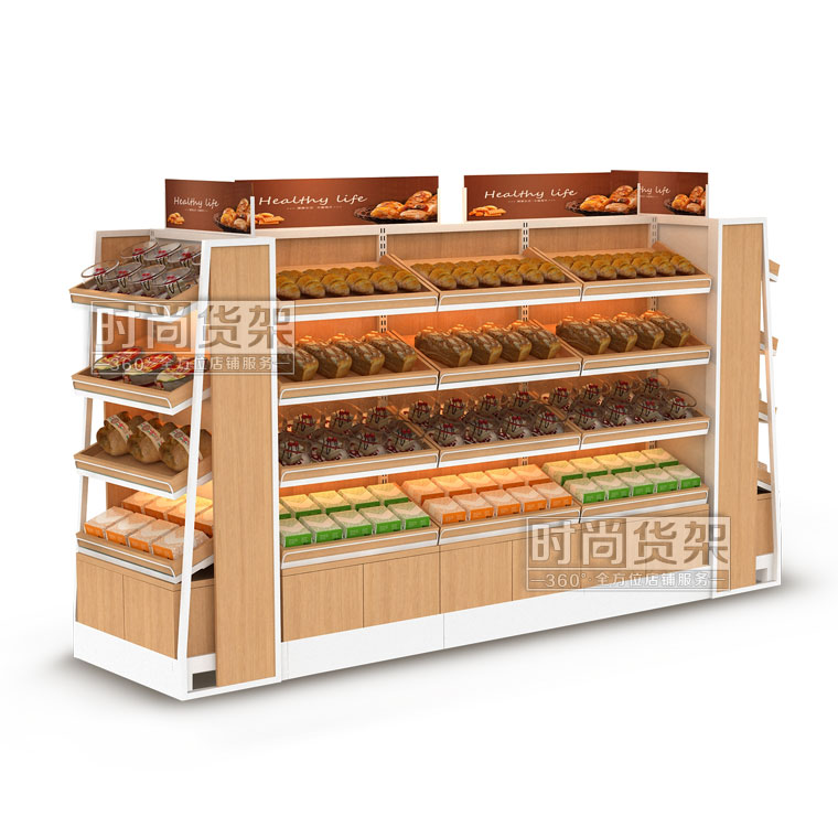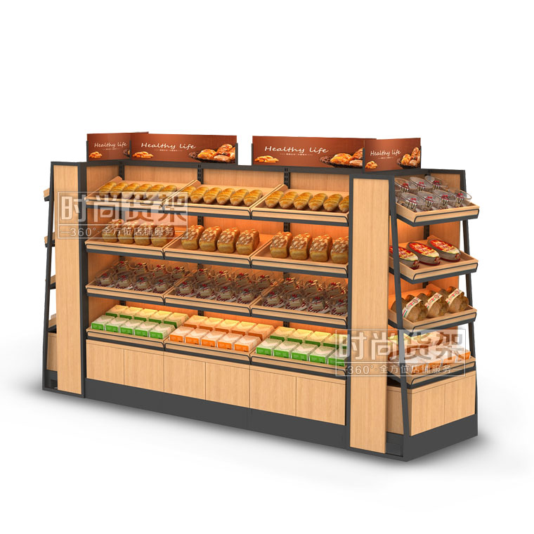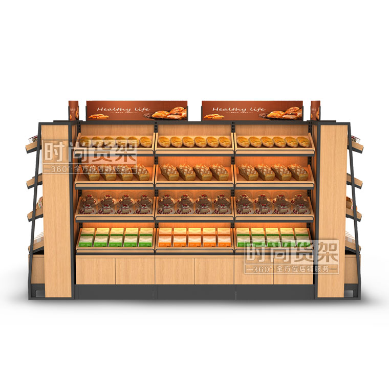 【描述】這款便利店面包貨架為雙面便利店貨架,擁有極大的商品展示面積,方便顧客更好地選購所需的商品。鋼木結合的材質選擇,讓面包架在承重性能上有著超乎想象的表現,并且時尚木質背板彰顯了貨架本身的精致與高端,更有利于打造優秀的便利店陳列展示設計。