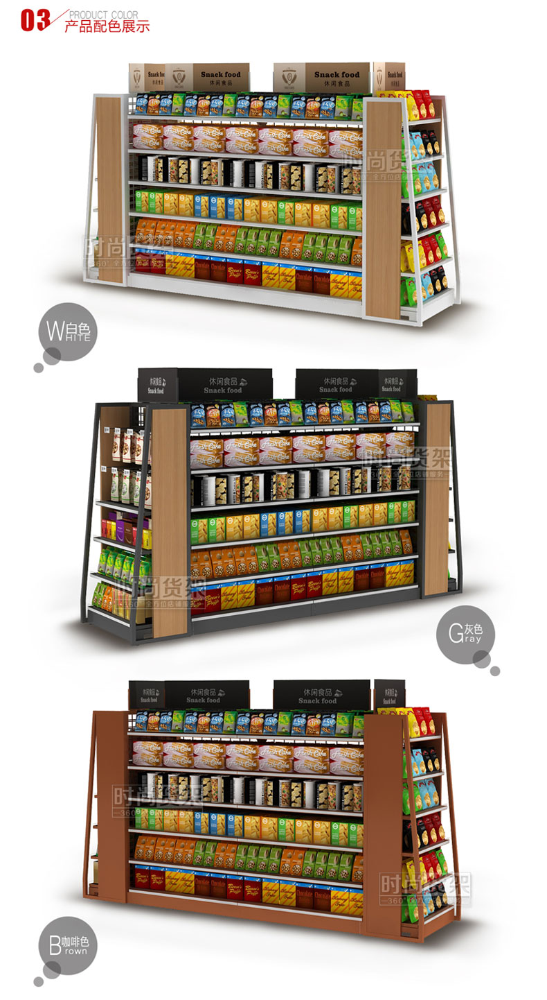 此款貨架為超市貨架廠家時(shí)尚貨架專為超市食品區(qū)域打造,整體框架由優(yōu)質(zhì)冷軋鋼材精制而成,承重性強(qiáng)。